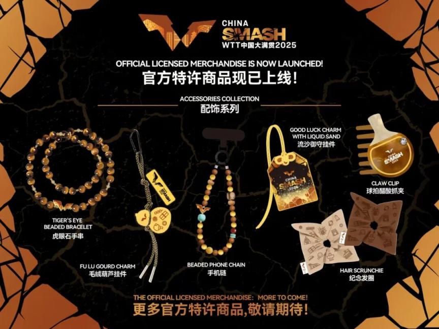 配饰系列围绕日常佩戴与赛事收藏双重功能,推出手机挂链、虎眼石手串,以及抓夹、发圈等多款发饰;同时提供毛绒葫芦、流沙御守等多款挂件类配饰。该系列将乒乓球赛事元素与实用属性融合,满足消费者对纪念意义与时尚风格的双重需求。这些配饰不仅在日常穿戴中增添个性与运动活力,更能让球迷随时随地感受赛事氛围、将竞技体育的热情与美好寓意融入生活细节。