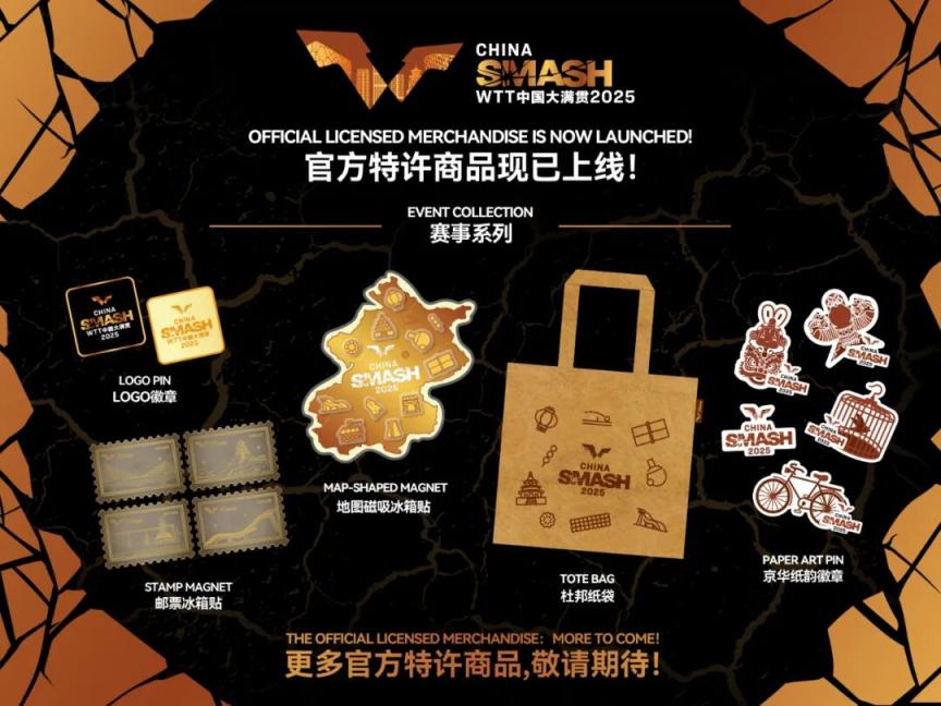 赛事系列产品兼具艺术感与实用性,既涵盖LOGO徽章、北京文化元素棉纸徽章、邮票纪念冰箱贴等经典纪念品类,也包含杜邦纸袋等创意实用单品,融合乒乓球文化和北京城市文化,成为日常生活中可以佩戴和使用的时尚单品,让热爱可触碰、可陪伴,成为传递体育精神与城市情怀的独特载体。