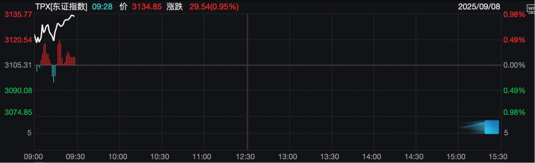 同时,日本东证指数突破8月18日高点,升至历史高点3135.77点,日内涨幅超0.9%。